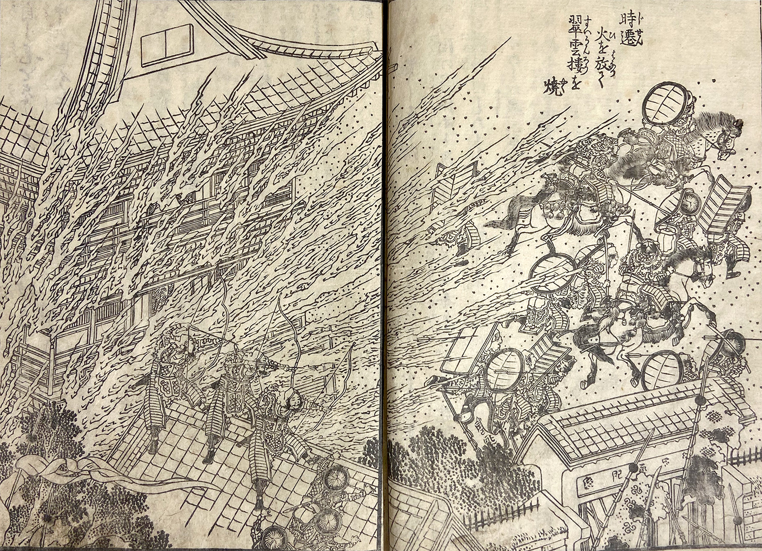 こちらは、敵軍の攻撃を受け、建物から勢いよく吹き出した炎が燃え広がる場面が描かれています。画面右から伸びるような炎から、手前で弓矢を構える兵士たちの背中を押すように追い風が吹いていることが感じられます。