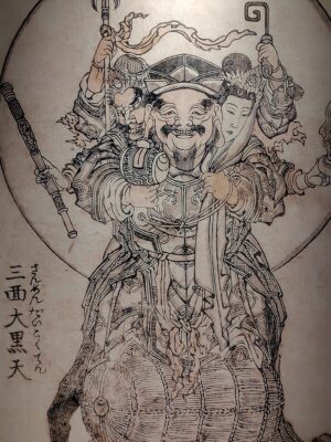 大黒天に弁財天と毘沙門天の顔がついた、ちょっと不思議な感じの神様ですが、かの豊臣秀吉が信仰したという立身出世を象徴する神様になります。