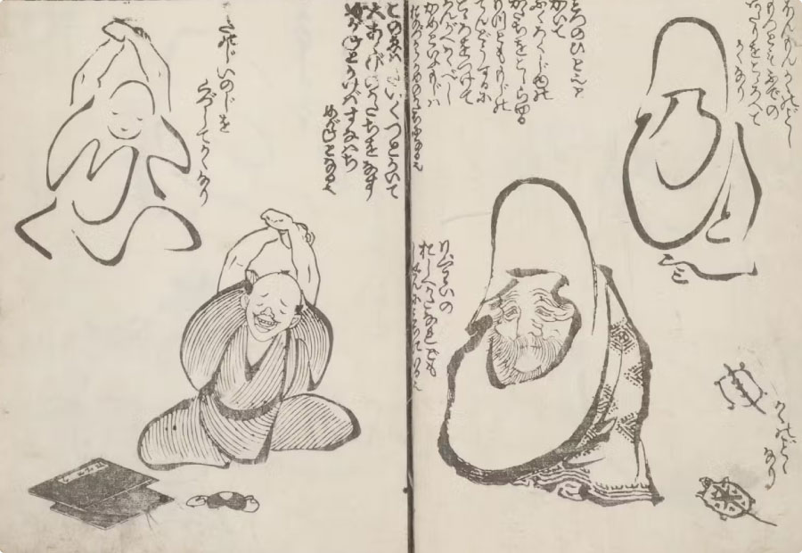 The term ryakuga (“simplified drawings”) refers to images whose subjects are portrayed using abbreviated shapes and concise brushstrokes. Random Drawings by Hokusai [Hokusai manga] is said to have taken inspiration from Kuwagata Keisai’s The Abbreviated Drawing Style [Ryakugashiki], whose preface contains the following commentary: “[These images] capture the spirit without relying on form. Their ‘abbreviated drawing style’ omits what can be left out without fixating on form.” These words show that Keisai’s ryakuga were not considered merely simplified depictions but were rather thought to reveal something essential about their subjects despite eliding the details.