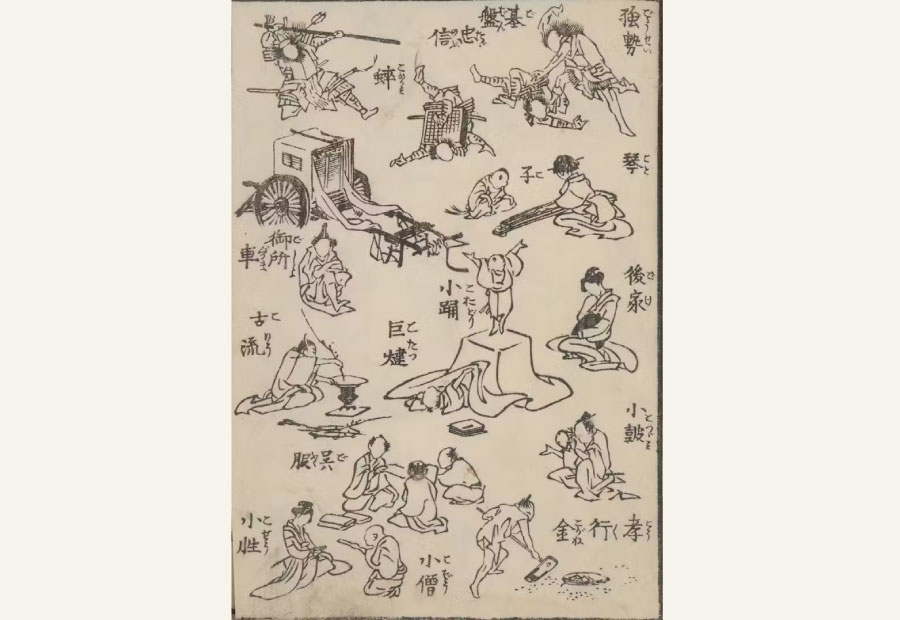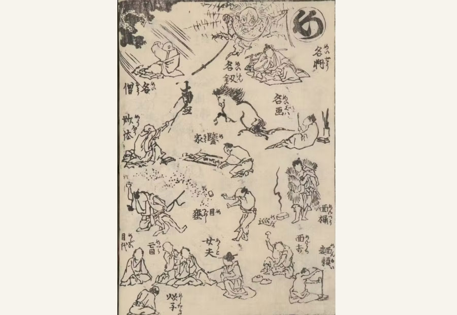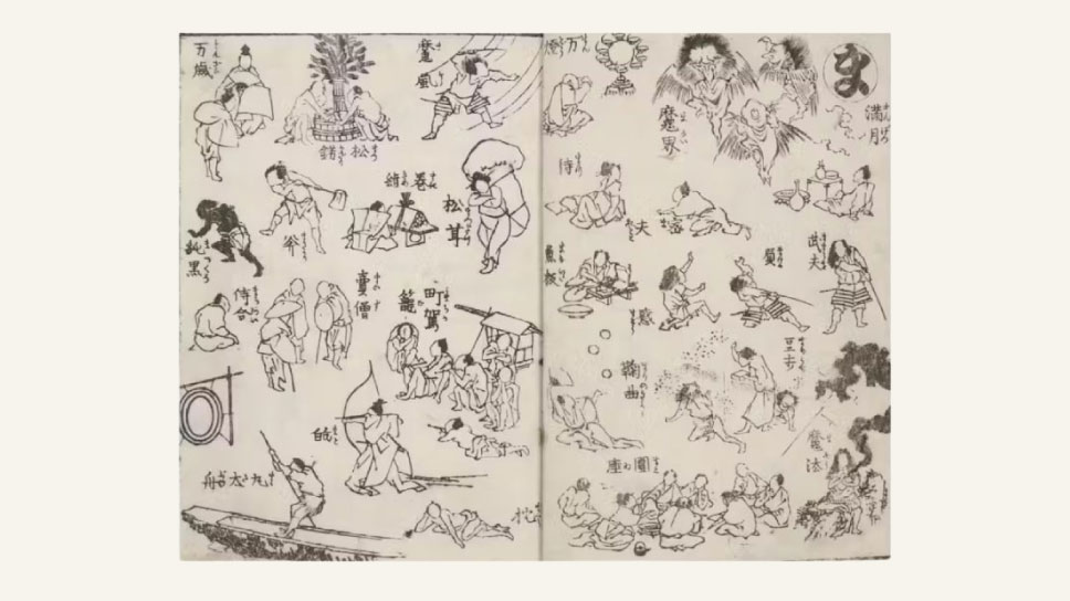 Shortly after turning fifty, Katsushika Hokusai began devoting his energies to the production of copybooks like Random Drawings that frequently included ryakuga. The style was well-suited for copybooks as it allowed the inclusion of multiple smaller, simplified depictions of subjects on a single page. For example, A Picture Syllabary [Ehon hayabiki], which introduces various subjects organized according to the Japanese syllabary, contains between thirty and forty ryakuga images on each spread. This abbreviated style was not, however, chosen only because it made it possible to cover many subjects in limited page space.
