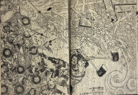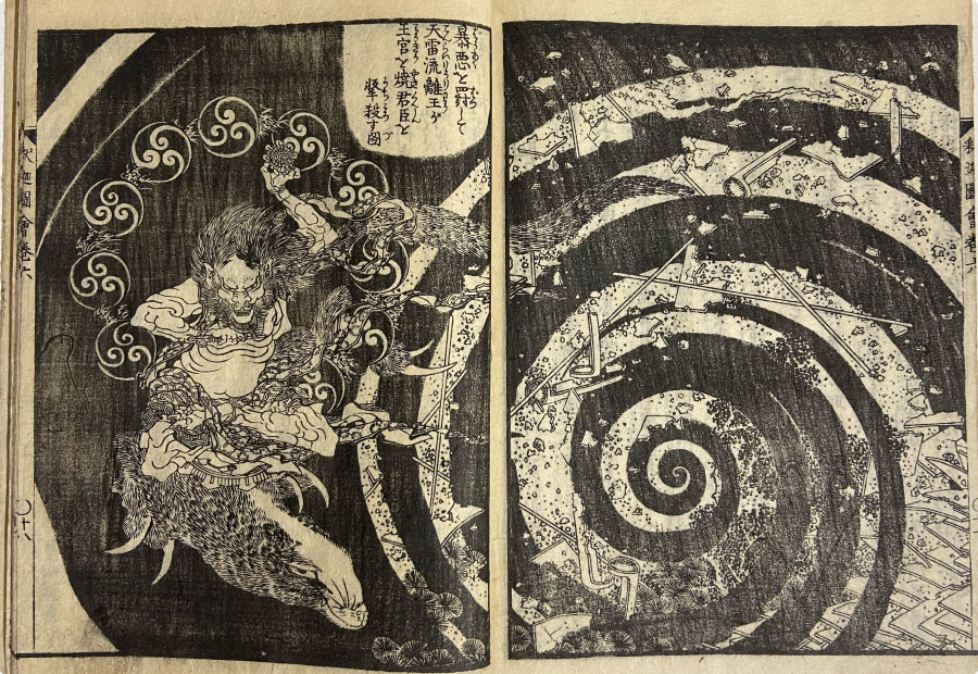 He also turned his insatiable appetite for painting to weather and light, depicting roiling clouds, rain pouring down like arrows, and lightning that steaked across the sky. The flashes of lightning that race across the base of Mount Fuji and bursts of light that accompany explosions in his block-printed books, despite being black and white, are so dazzling that a viewer might instinctively seek to shield their eyes.