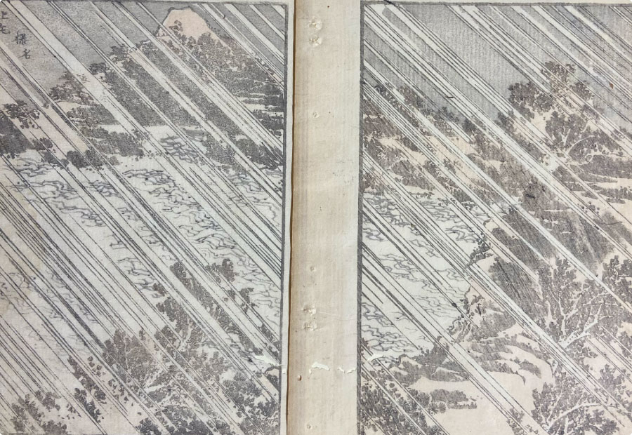 彼はまた、渦巻く雲や、矢のように勢いよく降り注ぐ雨、雲間を駆け抜ける雷などの天気や光にも目を向け、貪欲に描いた。版本作品に見られる、富士の裾野を走る稲妻、爆発によって弾き起きる凄まじい閃光の表現は、モノクロ作品であるものの、思わず目を覆いたくなるような眩しささえ感じさせる。