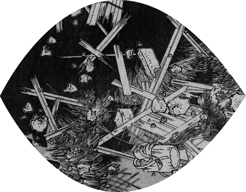 こう⾒える!ドカン!ぐらぐら、ガラガラ、ズシン!そんな⾳や、体を揺さぶる振動さえ感じられそうな本図は、宝永4年(1707)に起きた富⼠⼭の噴⽕に伴う災害を描いたものだ。⼀夜にして出来上がった「宝永⼭」の出現を、あえて⼭の姿を描かずに、崩壊していく家屋や⼟煙で表現している。⼈間では到底敵わない⾃然界の⼤きな⼒と恐怖を感じさせる作品だ。
